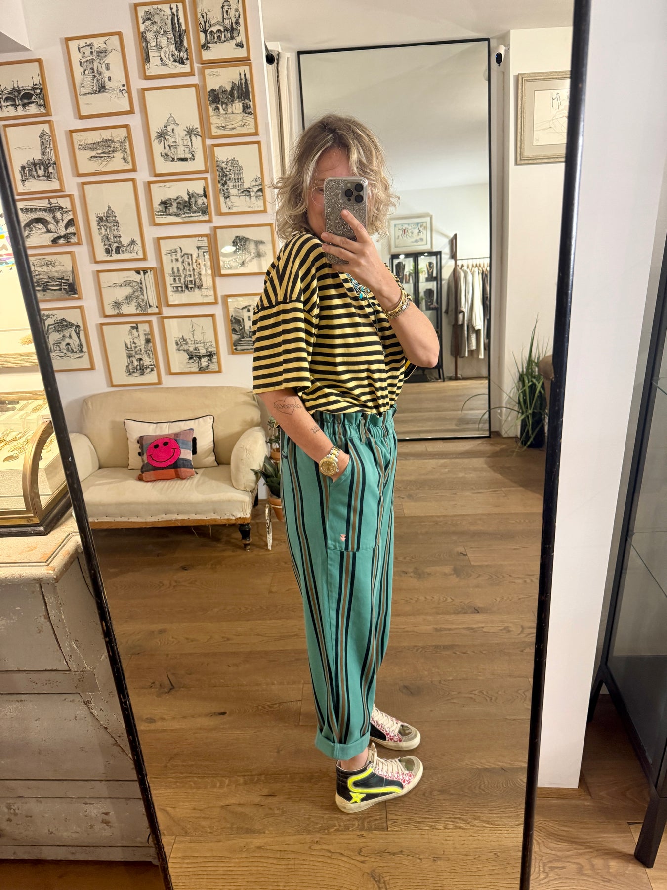 Say hello to the new Stripy pants. Made in Portugal to embody timeless tailoring and fine craftsmanship. Featuring a flattering high rise waist. They showcase classic vertical stripes that visually lengthen the legs and enhance your silhouette. The dual-button fastening offers a polished touch, while a discreet embroidered logo adds an understated hint of  personality. Perfectly balanced for any occasion, these trousers pair beautifully with tucked-in blouses or structured knits, made to stand out with quiet elegance.