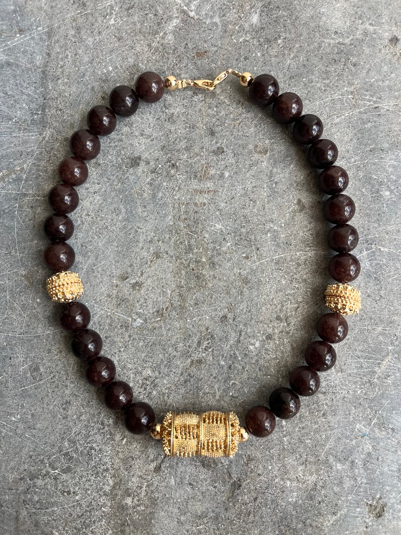 The Doukala necklace is the latest signature from Un Dimanche à Paris, where the raw beauty of natural minerals meets refined design. It features a bold gold-plated filigree barrel center piece, framed by two intricately detailed gold ball beads and smooth stone beads in deep, earthy tones. Finished with an adjustable Indian Dori cord and brass-plated lobster clasps, it offers versatile styling or can be worn without the cord by simply linking the two clasps together. Handmade in our Marrakech workshop, each piece reflects the charm of true craftsmanship and the contemporary spirit of UDAP.