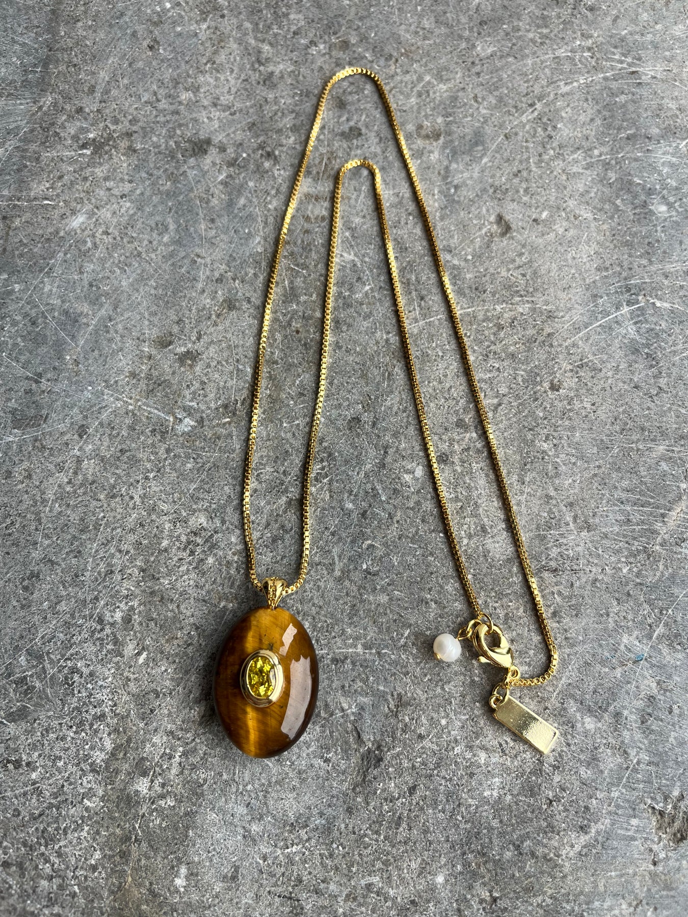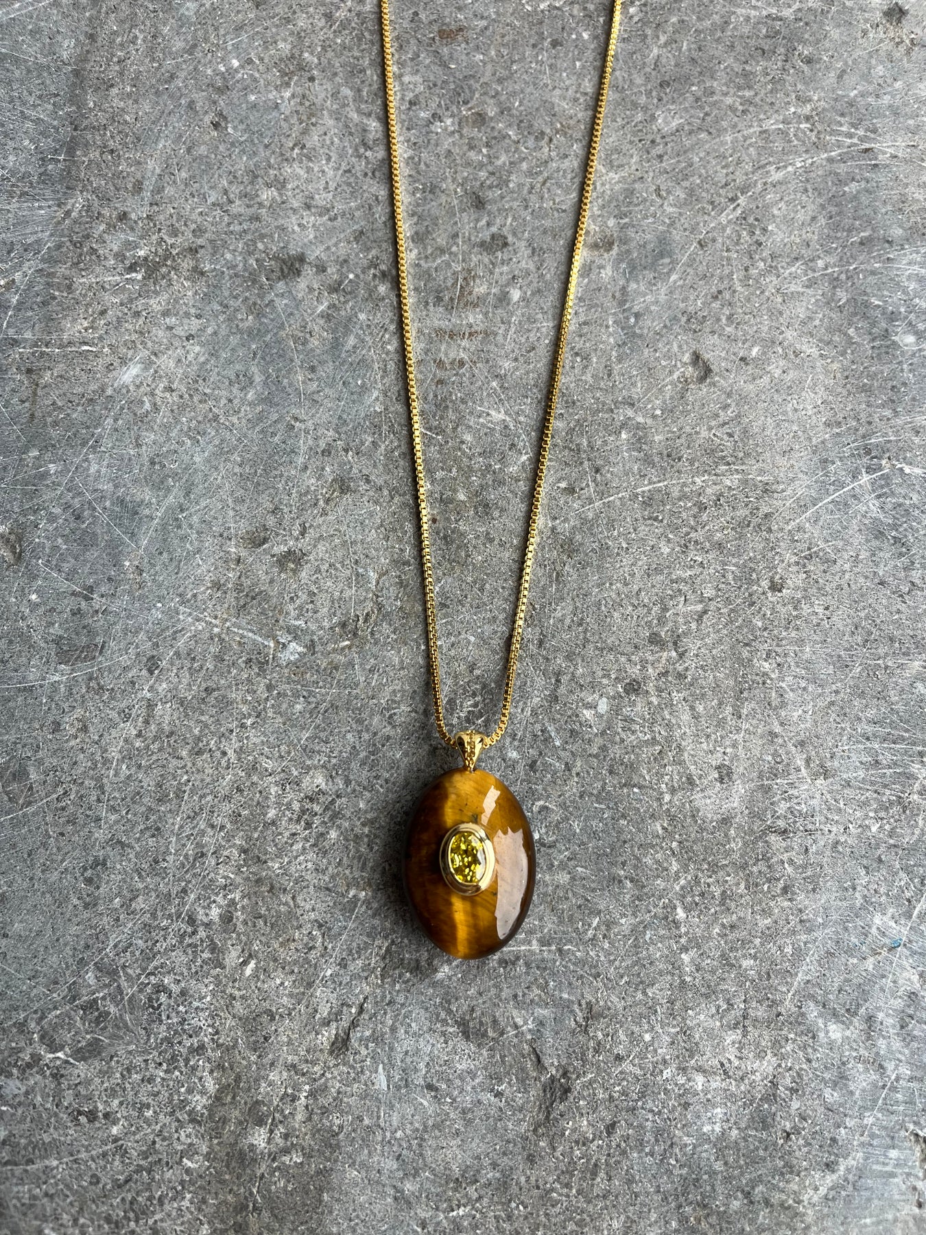 Say hello to the Ovale necklace, a truly unique piece of wearable art. Each pendant is lovingly made using natural semi‑precious stones, meaning one of a kind. An oval shape stone with a gold framed eye accent with an eye catching stone adding a sleek touch. Perfect for your jewellery collection.