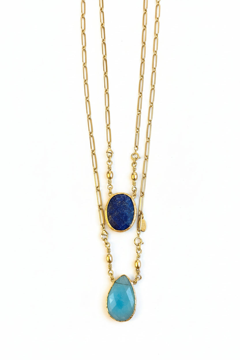 Elevate your everyday look with the Laire Necklace. Crafted in radiant gold plating and set with two striking crystal stones in mixed blue tones. This necklace adds bold contrast and detail to any outfit. It’s perfect worn on its own or layered with other favourites. A modern take from spiritual inspiration, this piece blends timeless style with versatile wearability ideal for gifting or elevating your own jewellery collection.
