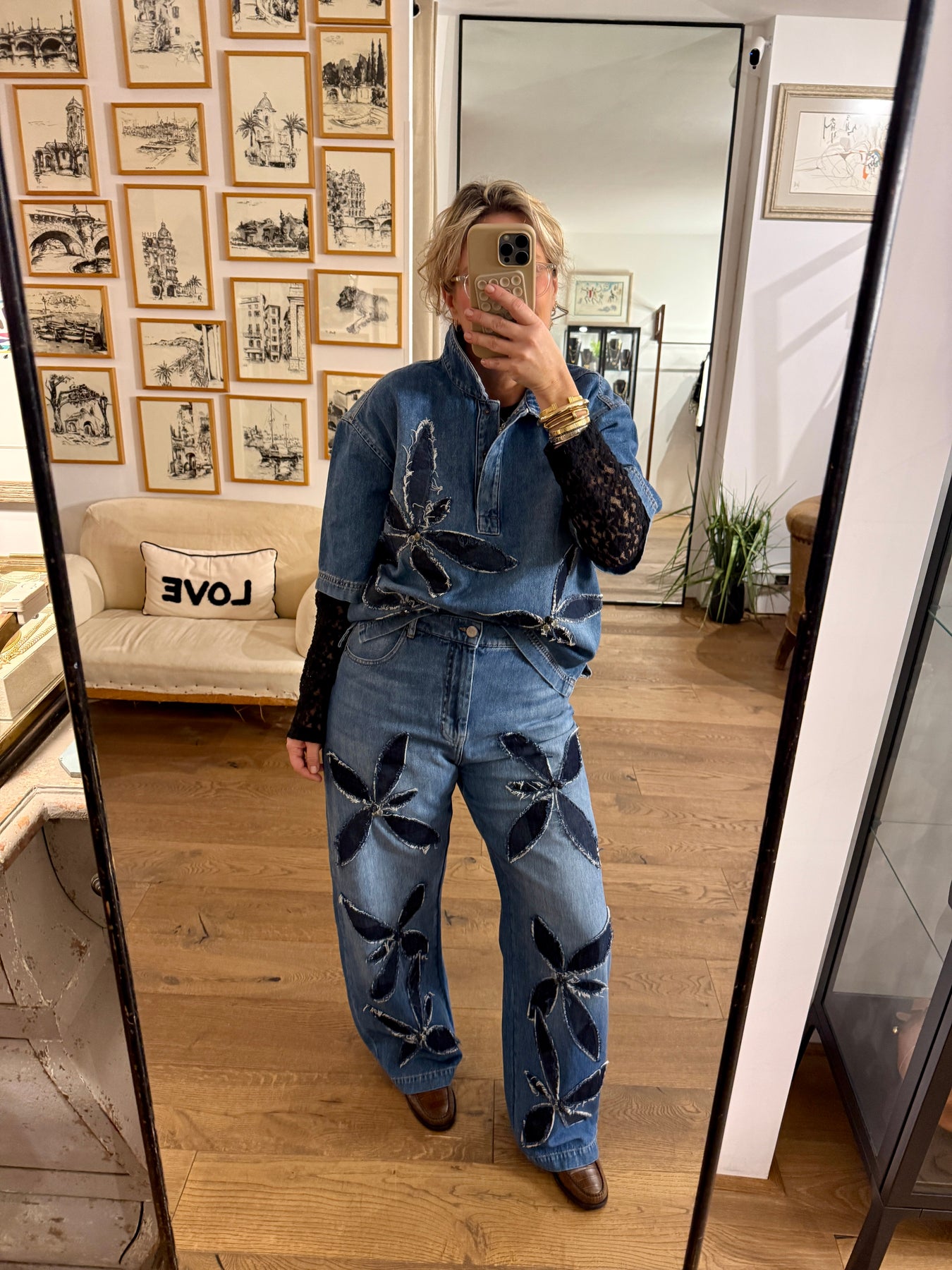 The Bimo jeans are crafted from classic denim with a high-rise waist, designed to elongate the silhouette and create a sleek, long-lined look. Featuring straight legs and five pockets, they are elevated with bold, contrasting floral appliqués along the legs for a modern, statement-making touch. Finished with a zip closure, these jeans perfectly balance timeless structure with playful, fashion-forward details.