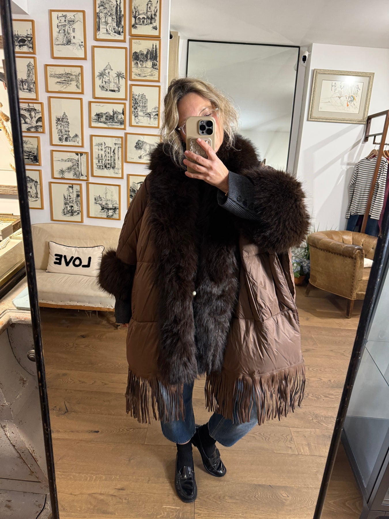 Wrap yourself warm in the Cherokee coat. Effortless winter elegance with this unique jacket. Designed to turn cold days into a style moments. Crafted with soft padding with a lavish faux fur trim that frames the silhouette. The relaxed, mid length cut give the perfect look with the fringe detailing along the hem adds a fun movement and personality.