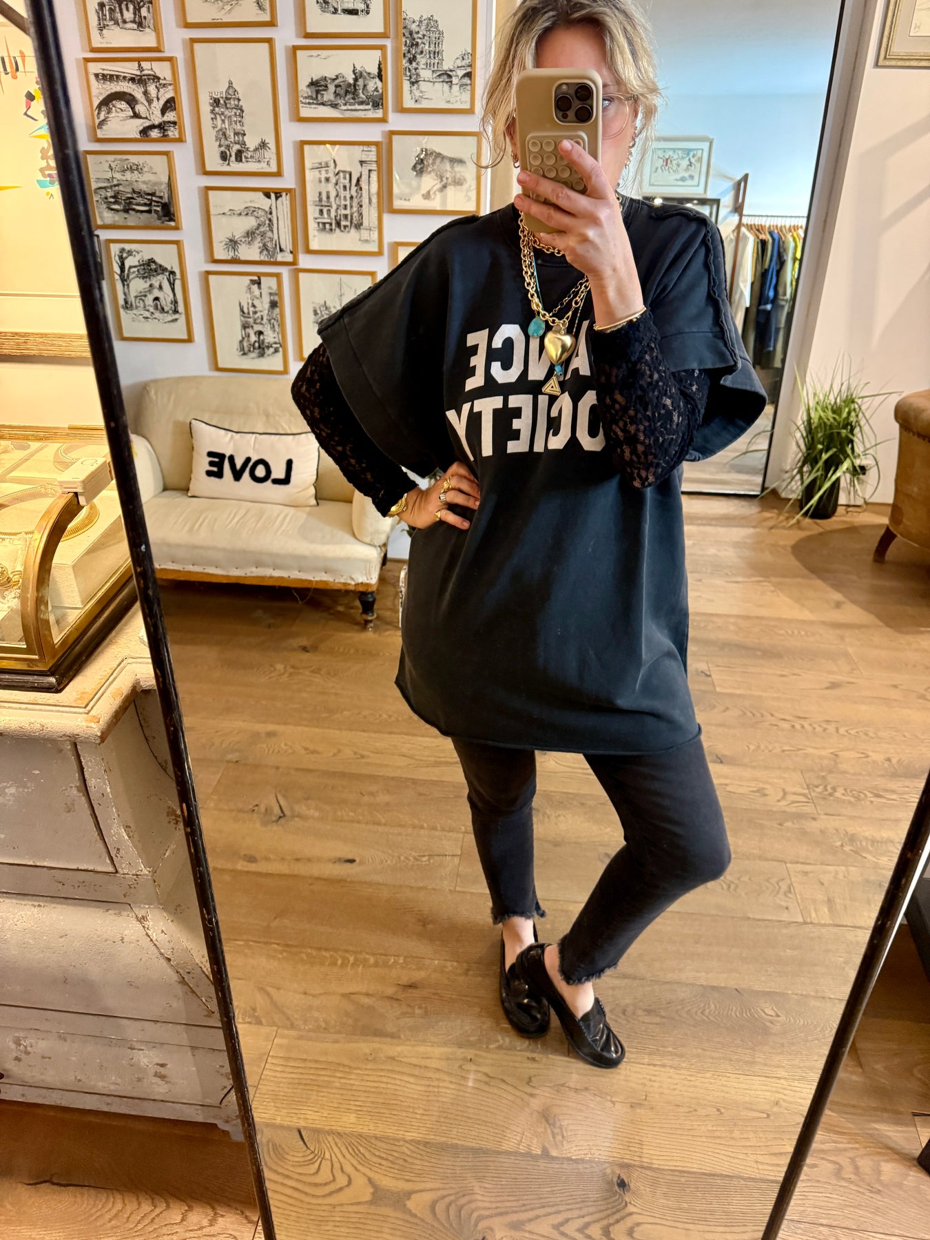 Featuring a bold statement such as “Dance Society,” it brings a confident, expressive edge to the silhouette.