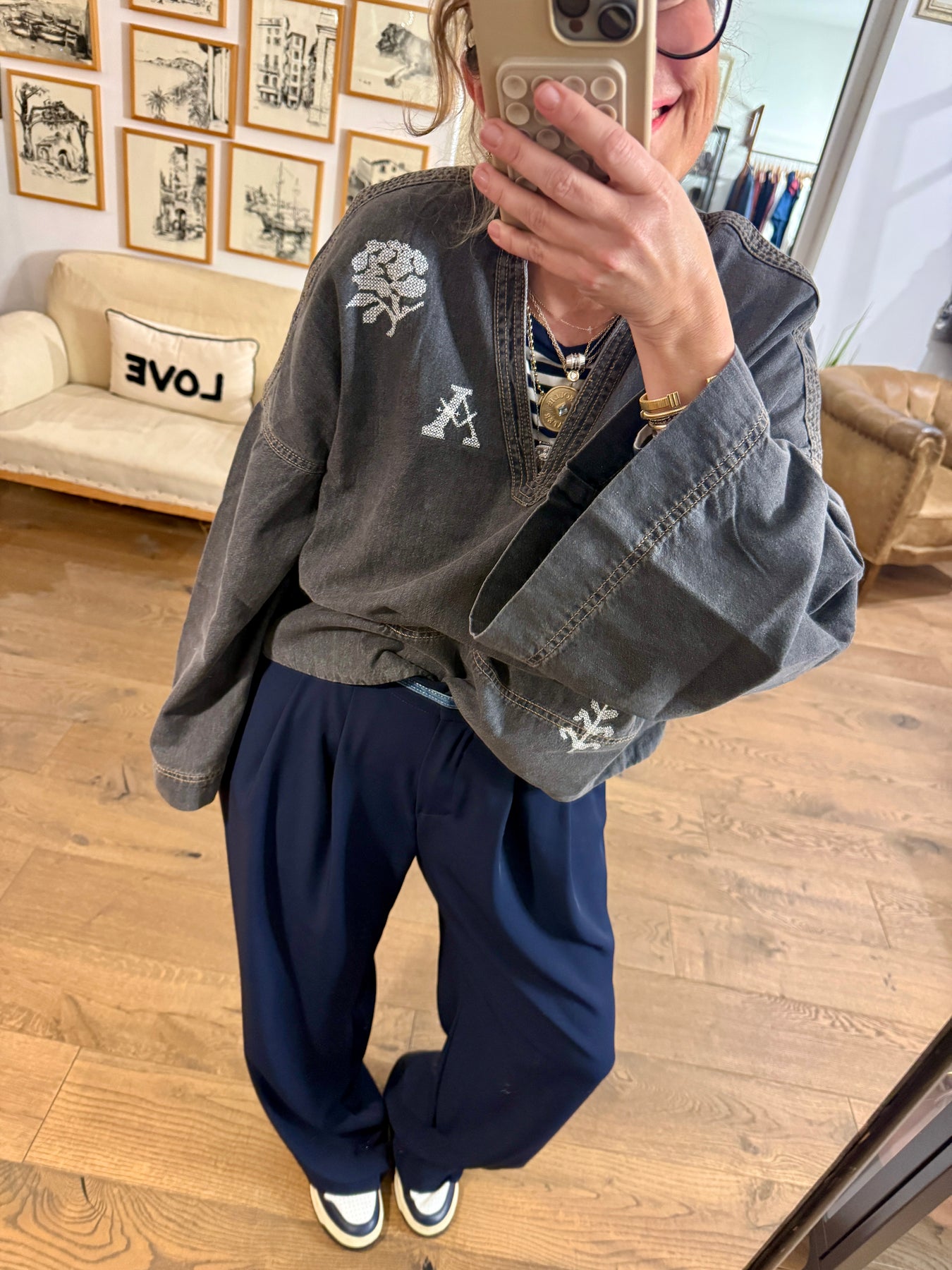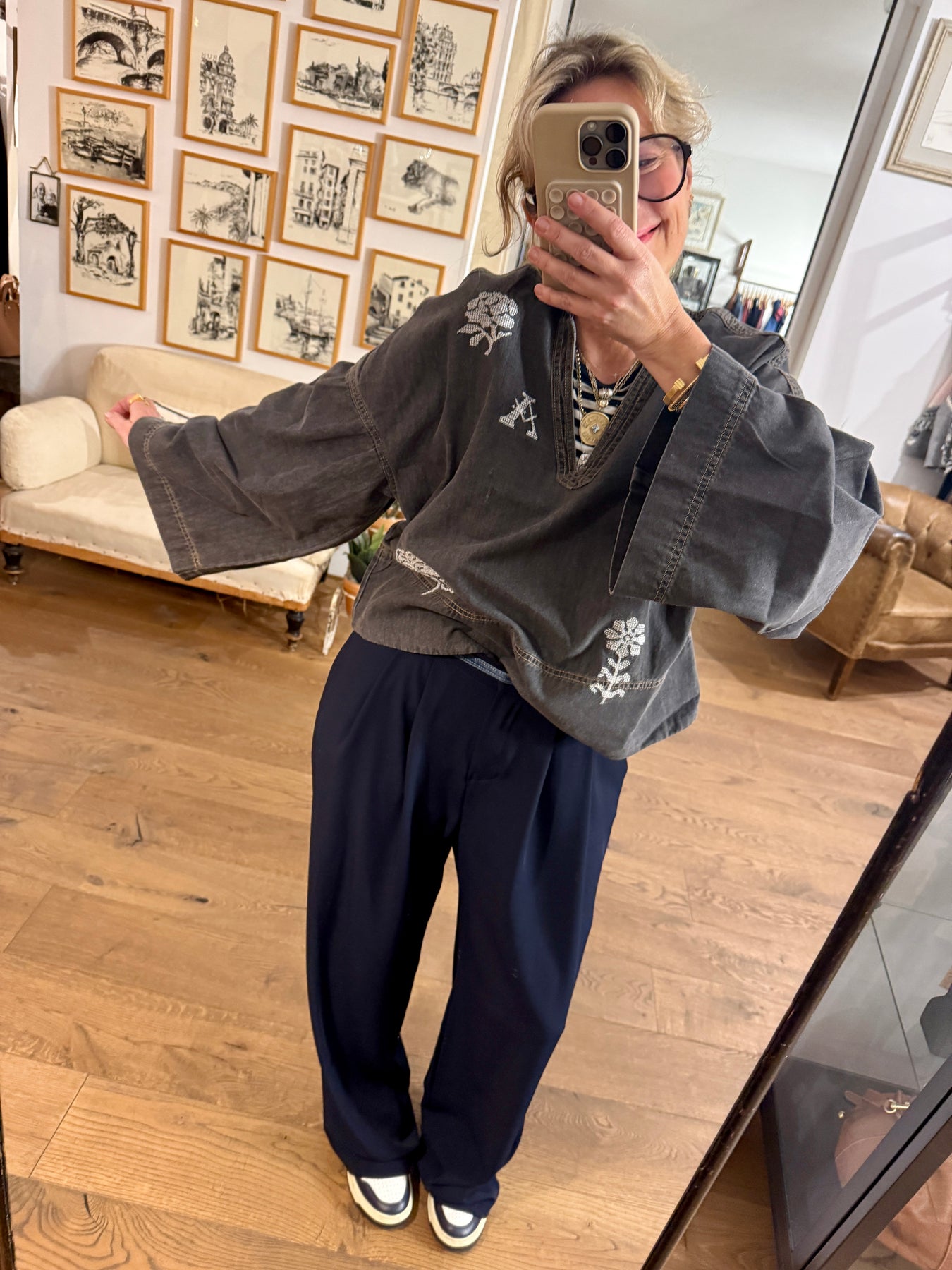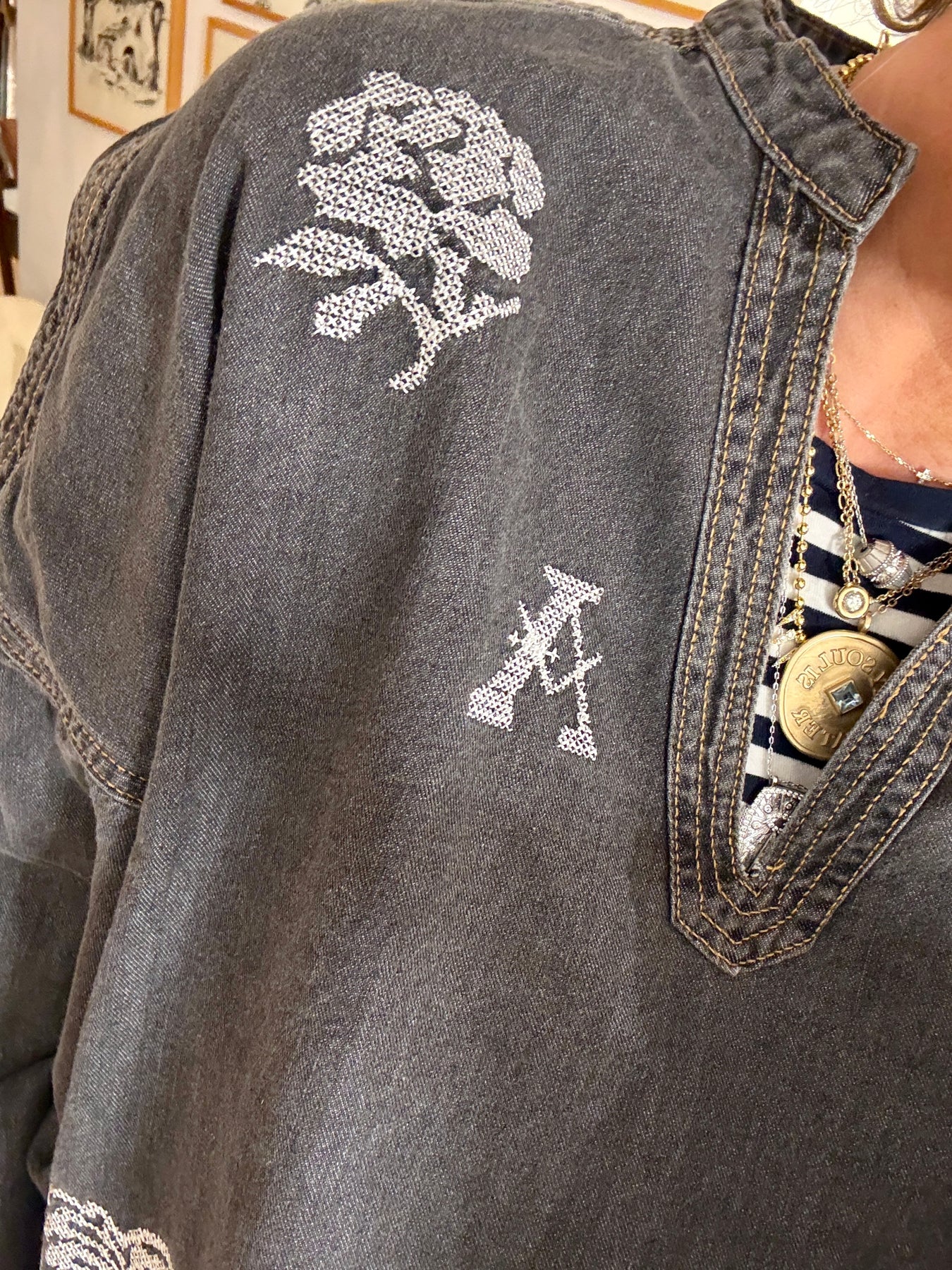 The Donatello top is a denim piece adorned with cross-stitch embroidered motifs directly on the fabric. It features trumpet sleeves, a V-neckline and is crafted from very soft, supple denim. Easy to slip on, it’s a simple yet stylish piece. One of the motifs represents an “A,” a subtle nod to love, Amour. A top to wear with pleasure and without moderation. A denim canvas top is always so timeless.
