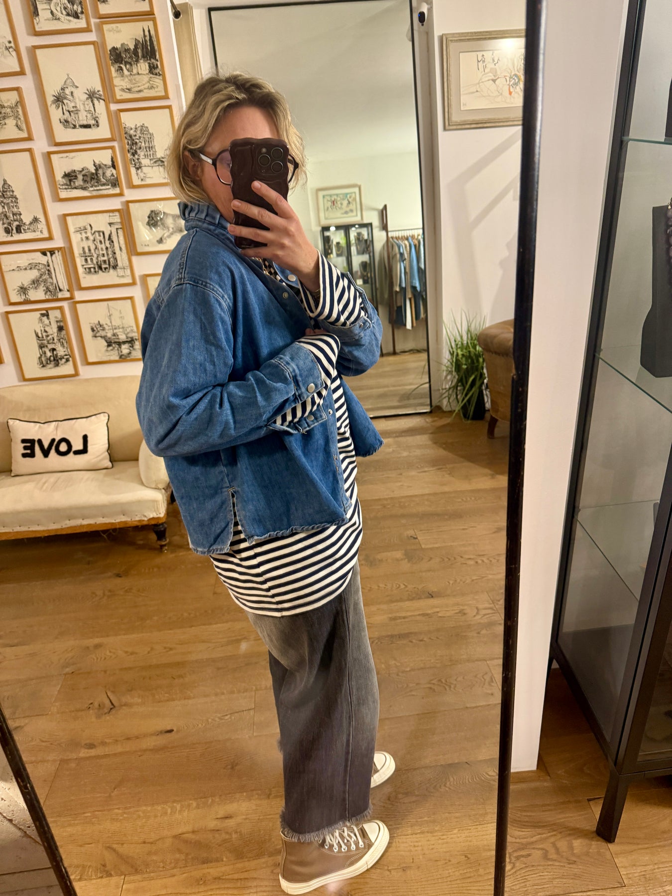 The Drawer is a faded black denim trousers with an effortlessly wearable fit, inspired by the shape of our famous Magic pants. The only difference: a slightly frayed hem that gives them a relaxed, modern edge. Designed with a straight-leg cut and crafted from an ultra-soft denim fabric, they offer comfort with an elasticated waist and flexibility for everyday wear. Featuring two pockets and a clean, easy silhouette, everything we love in the perfect pair of trousers. A timeless piece to add to your wardrobe and wear again and again, without moderation.