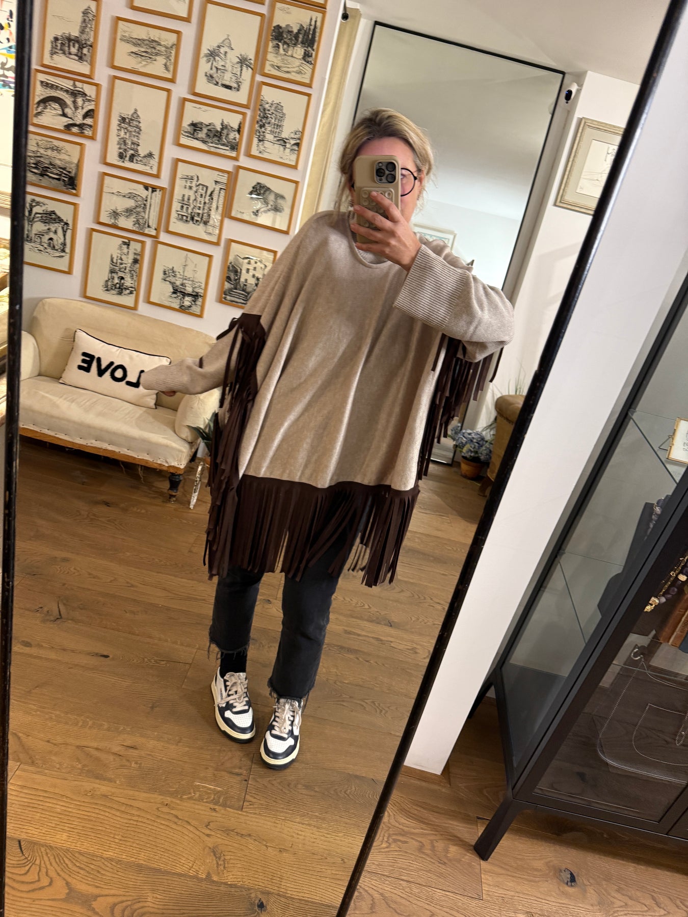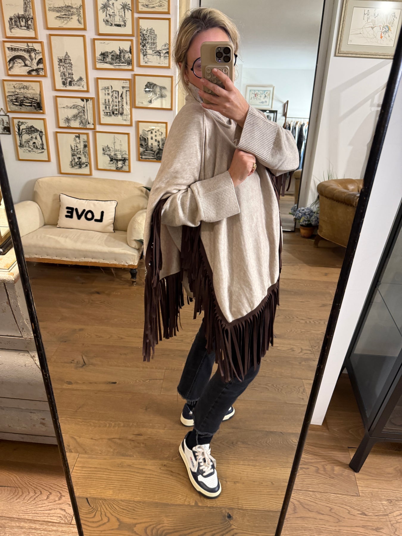 Wrap yourself in our Lewana poncho. Crafted in a soft, flowing knit that drapes beautifully over your frame. Featuring delicate fringe detailing along the hem that adds graceful movement and a touch of bohemian charm. This poncho delivers both style and comfort. The fringe adds playful elegance without overwhelming the design, making it a versatile addition to your year-round wardrobe.