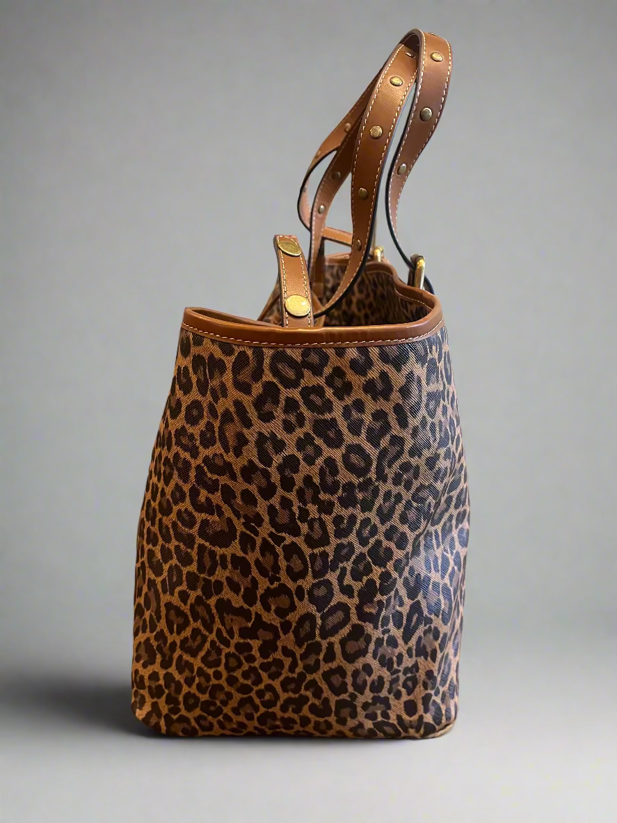 The Simple bag is your go anywhere tote that marries chic sophistication with everyday functionality. Crafted in leopard coated canvas with clean, refined lines and carried by two adjustable leather handles accented with rivets. It closes securely with a snap stud tab, offers hand or short shoulder carry. Inside you’ll find both a zippered pocket and a flat pocket fastened with a snap stud to keep essentials organised.