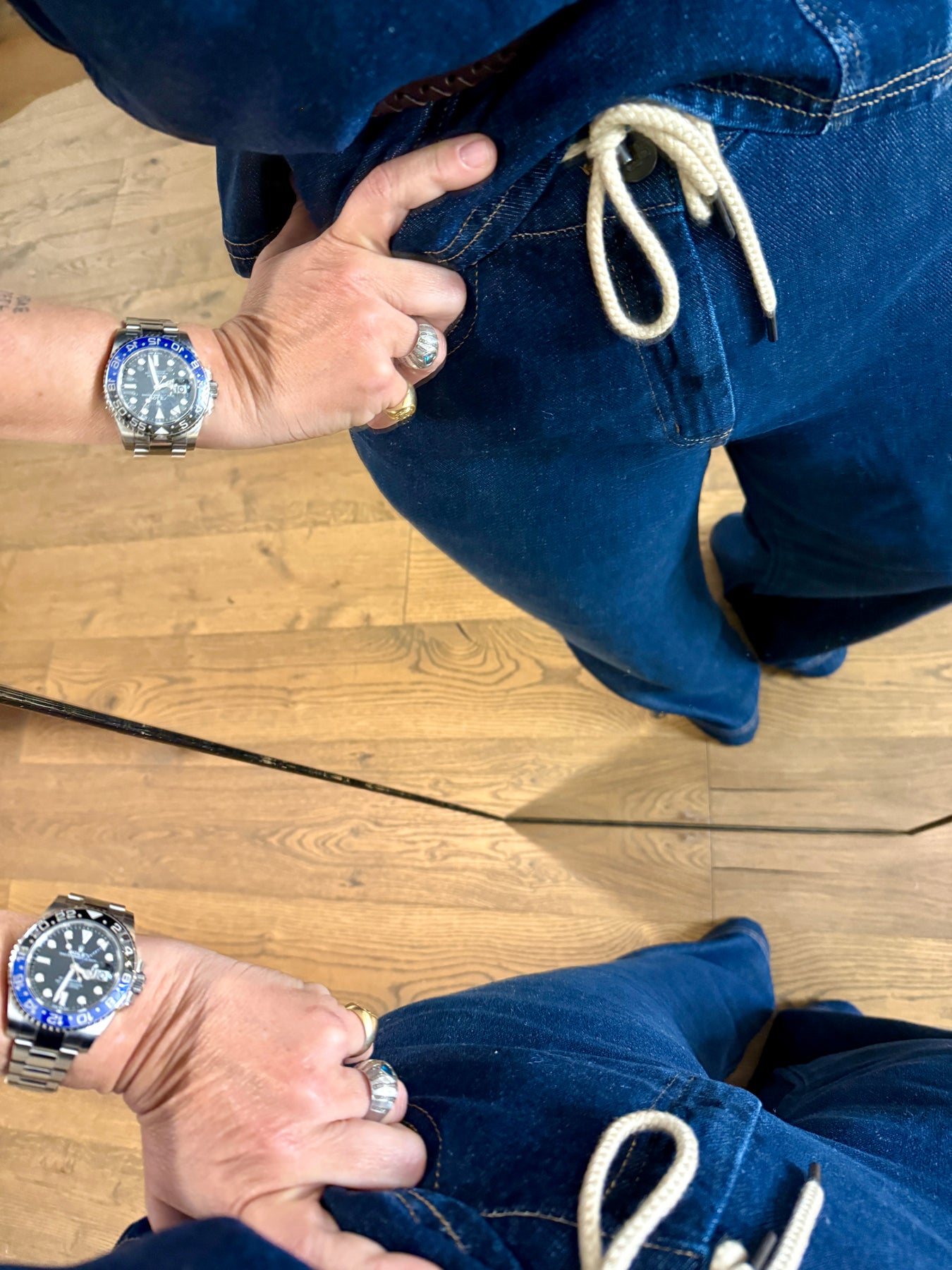 Please note that due to the nature of indigo denim, you may notice some natural fading in colour with wear and washing, this is expected and adds to the unique look of your denim over time.