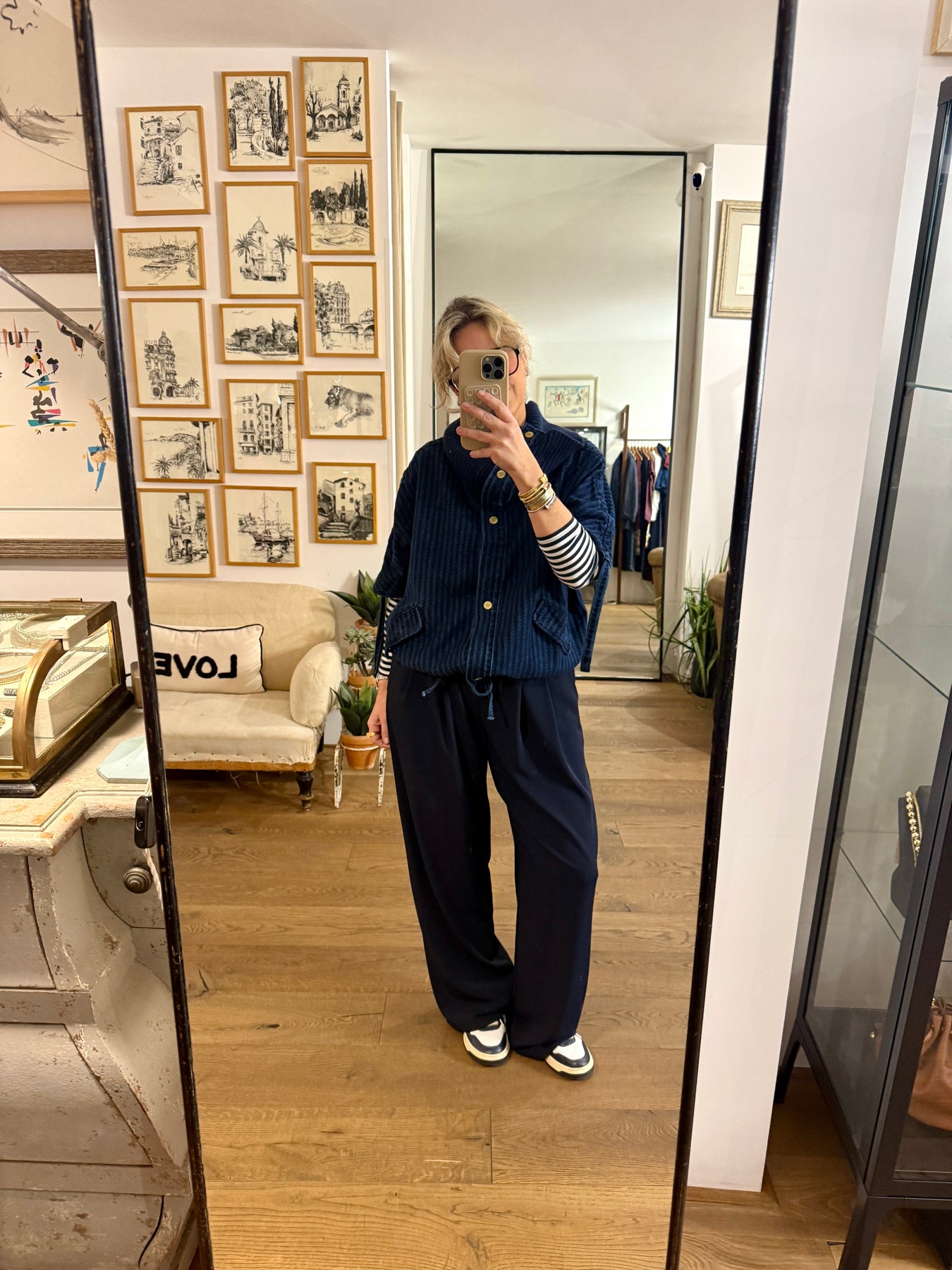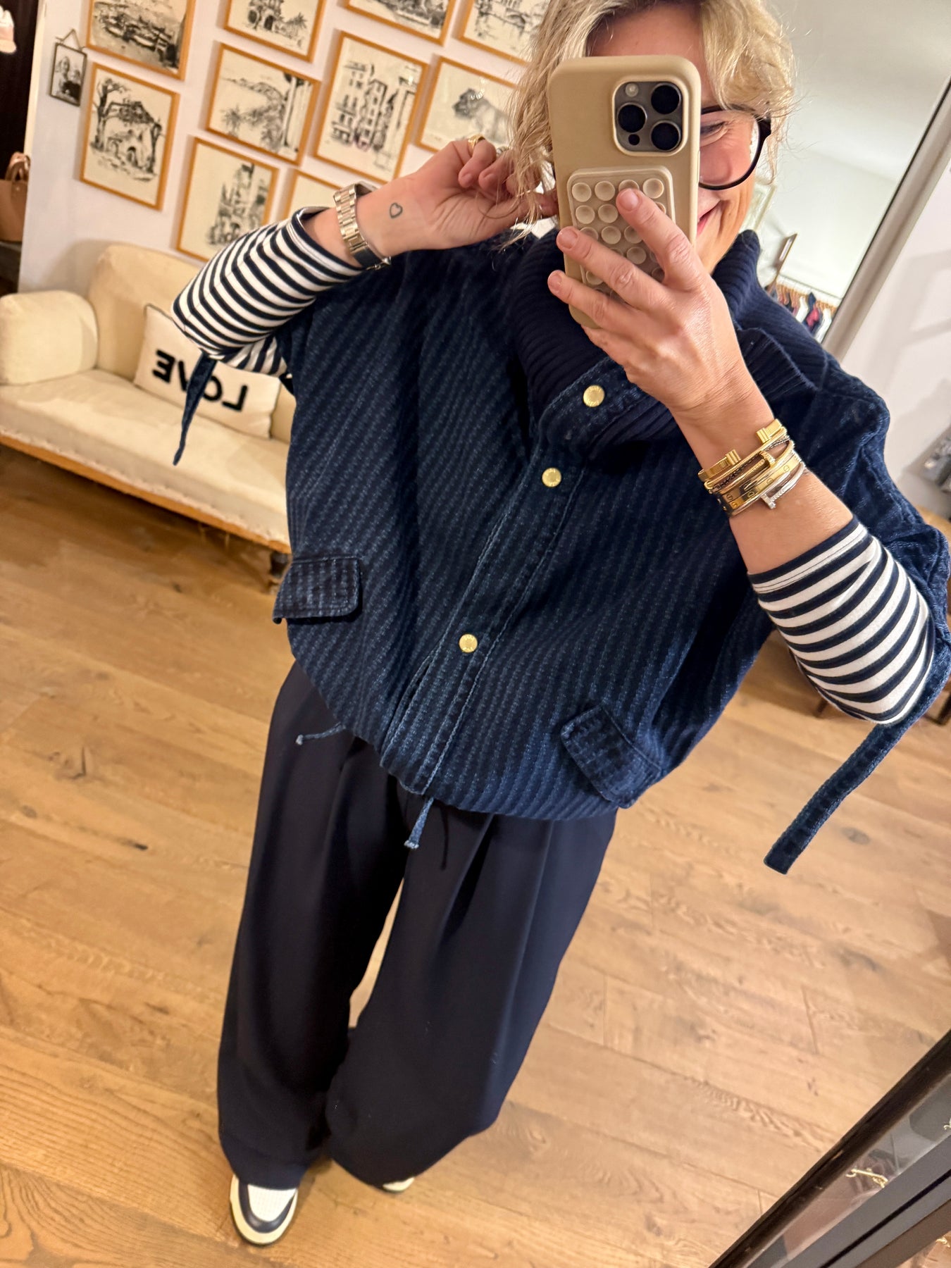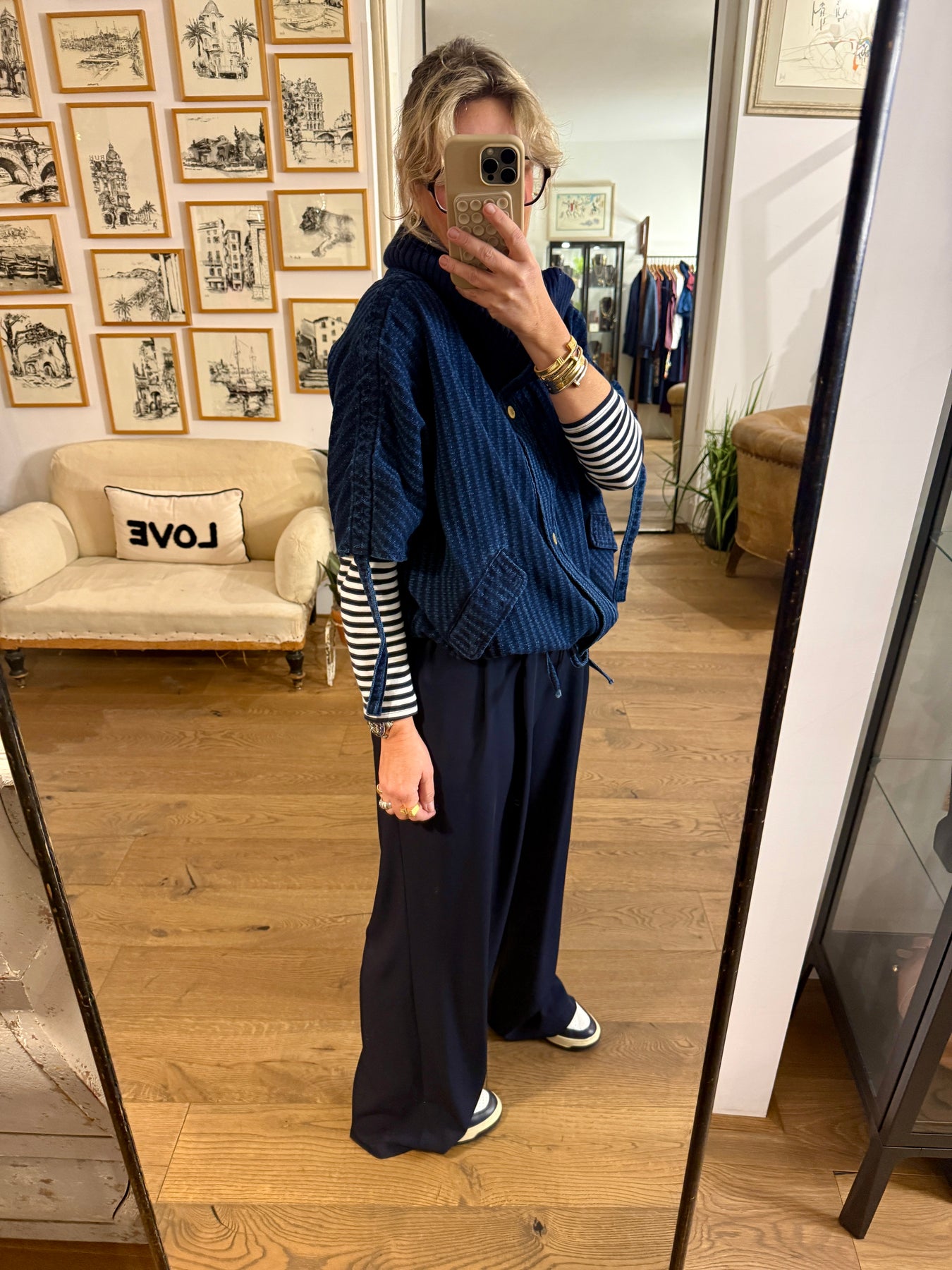 The Oryn jacket is a timeless piece crafted from cotton and denim canvas in a deep indigo hue. It features a high collar made of knitted cotton, reminiscent of a sweater, along with gold buttons. Adjustable ties at the cuffs and hem allow the jacket to be cinched for a refined silhouette. With its distinctive style and subtle nautical influence, this marine-inspired piece is effortlessly chic.
