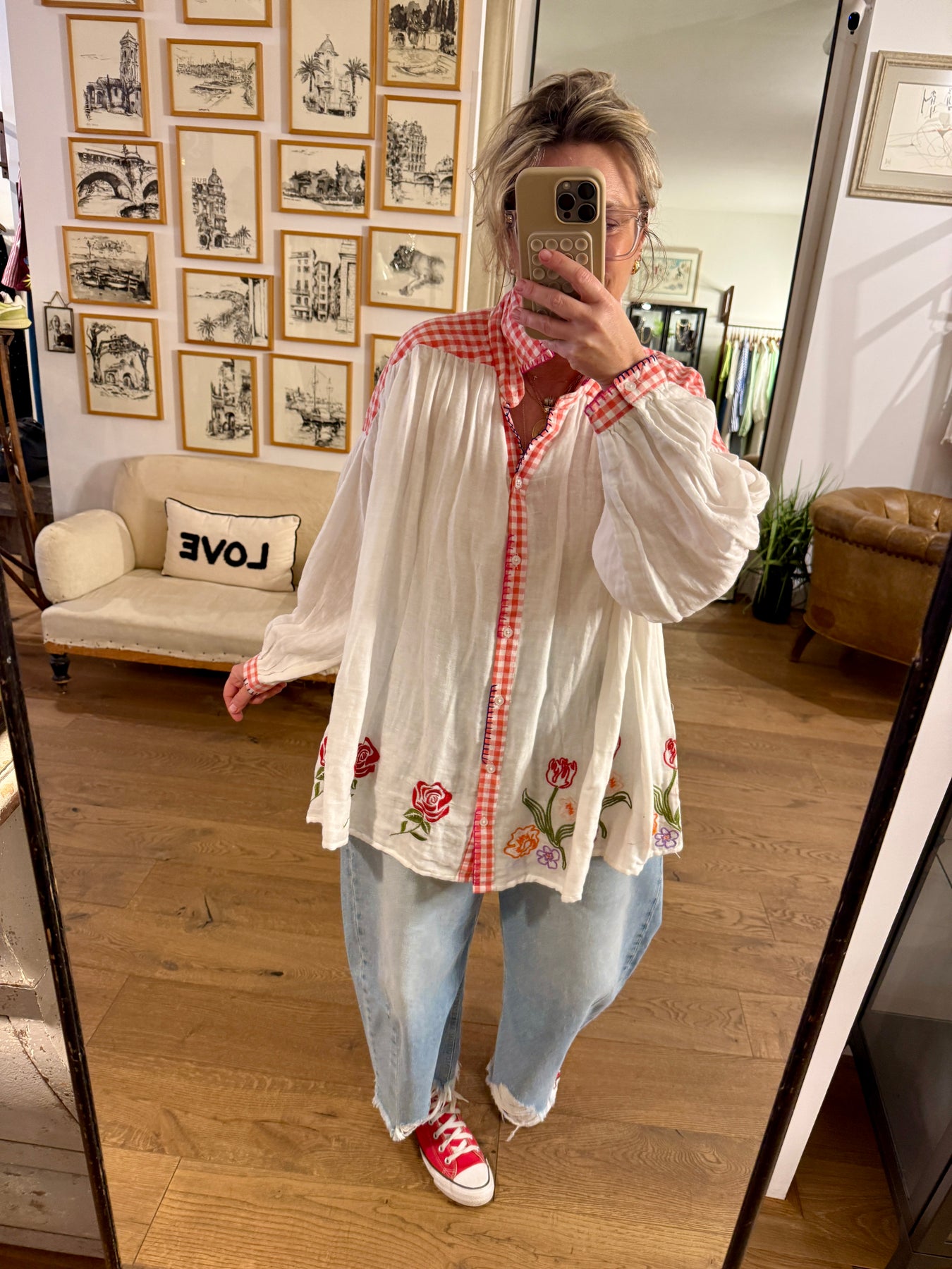 The Pappy blouse is a truly unique piece. Designed in a loose, stylised silhouette, it features delicate floral embroidery that gives it a beautiful artisanal feel. The collar, the trim, the upper back and the cuffs are crafted in red and white gingham fabric, adding a charming contrast and a distinctly French touch.